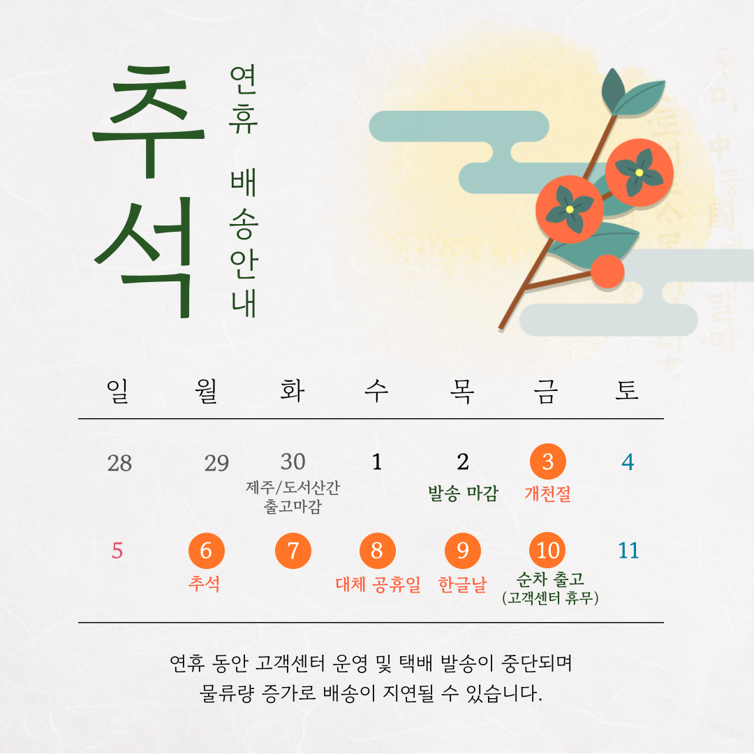 - 10월 5일(일) ~ 10월 7일(화) : 출고·배송 모두 불가 (연휴 기간)