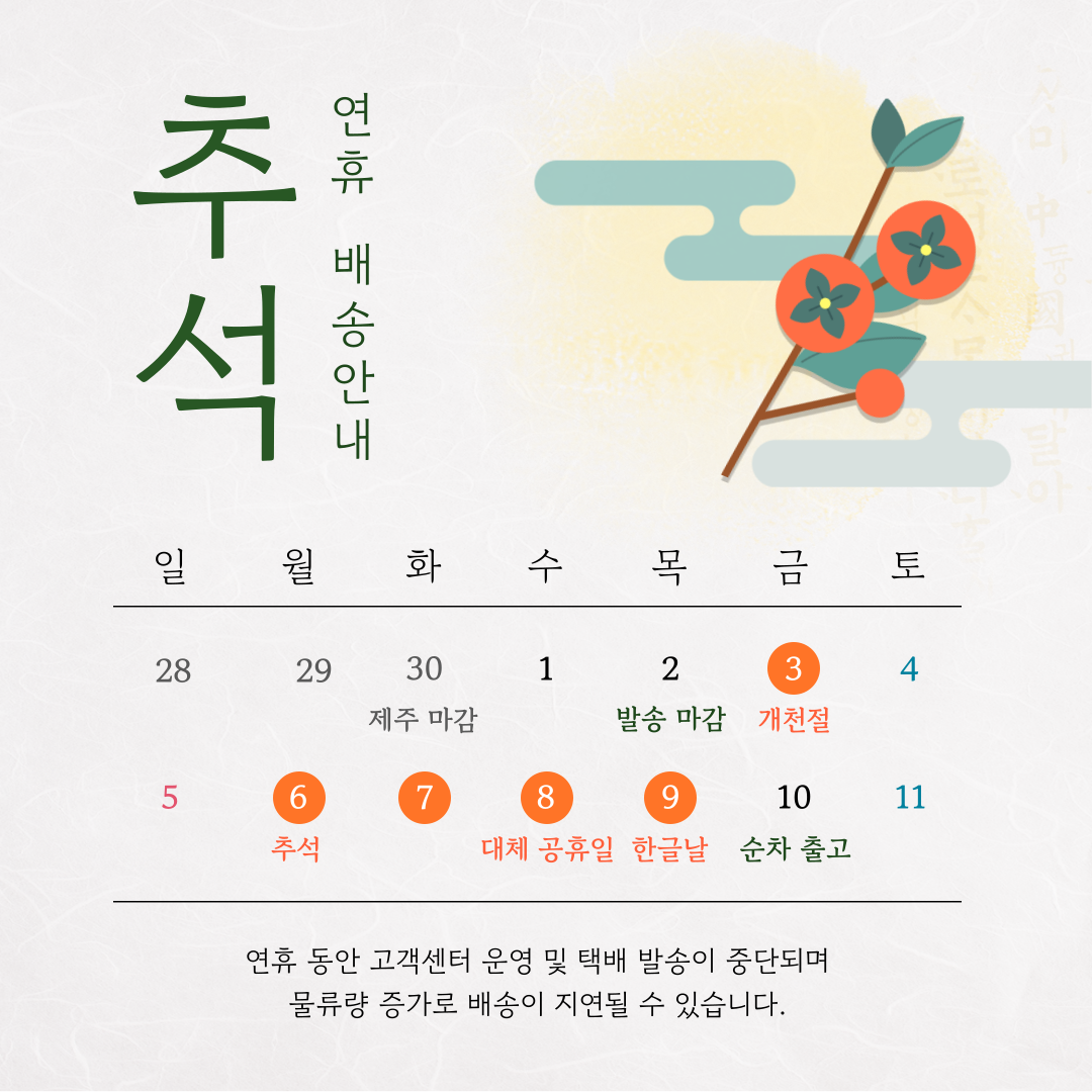 - 10월 5일(일) ~ 10월 7일(화) : 출고·배송 모두 불가 (연휴 기간)